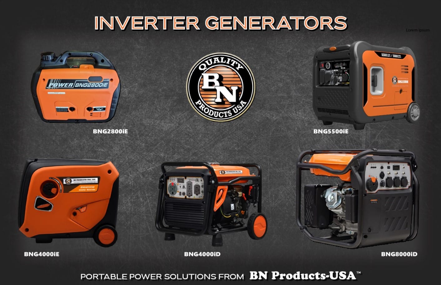 If an Inverter Generator seems right for you – BN Products-USA™ has recently expanded its lineup of Inverter units, now offering new inverter machines starting with the smaller BNG2300iSAC, and extending upward in power to the feature-rich BNG5500iE. All models feature economy operating modes, automatic safety features, and covered GFCI-protected outlets. Some units include Digital Smart LCD displays, remote electric starting, and active carbon monoxide (CO) monitoring.