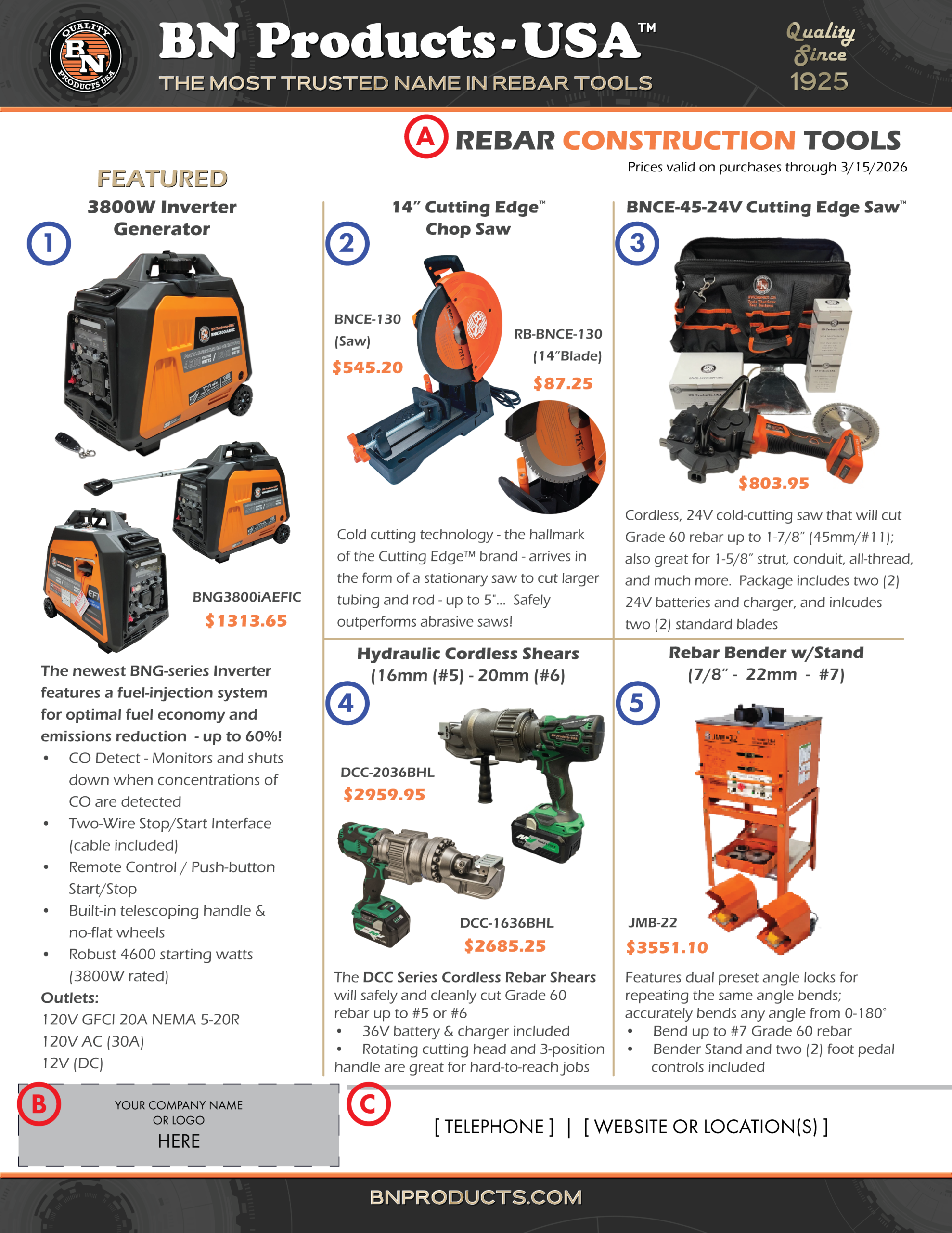 Do you need a flyer for an upcoming event or promotion? BN Products-USA™ can help you promote your line of BN construction tools for your special promotions, customer and sales events, and even trade shows.